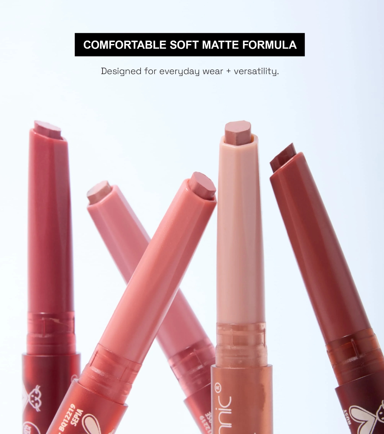 El lápiz labial Soft Matte Lip Crayon de Technic Cosmetics de acabado mate suave diseñado para conseguir unos labios más definidos, con efecto volumen natural y un acabado difuminado moderno en una sola pasada.