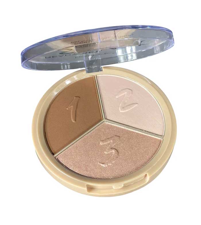 Esta paleta contiene 3 tonos para dar definición al rostro, creando luces y sombras para disimular o resaltar facciones del rostro.