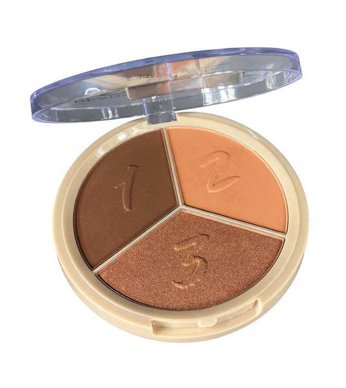 Esta paleta contiene 3 tonos para dar definición al rostro, creando luces y sombras para disimular o resaltar facciones del rostro.