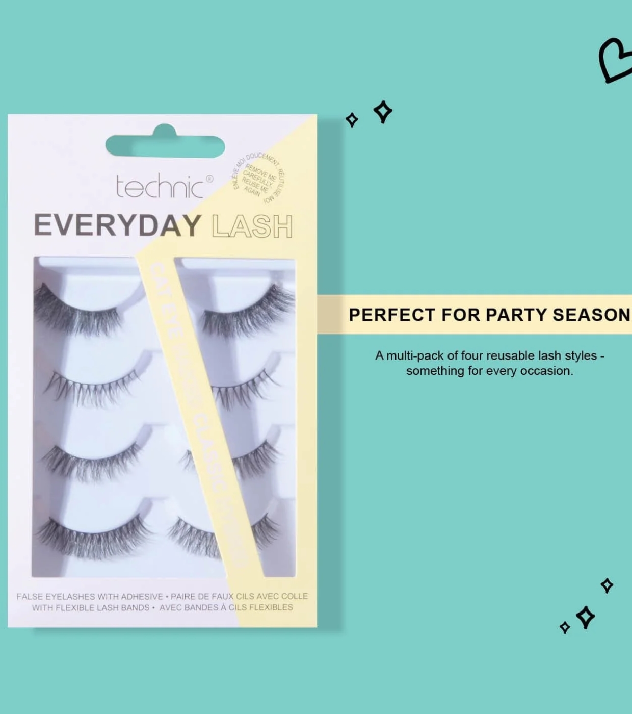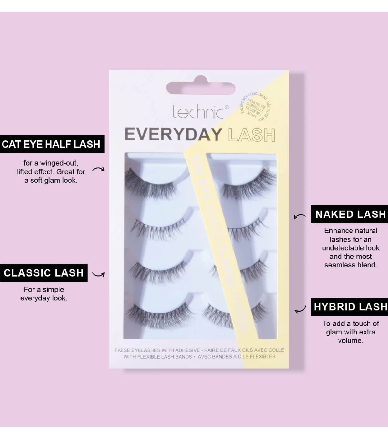 Elige el estilo de pestañas que mejor se adapte a tu estado de ánimo con este multi-set de pestañas postizas Everyday Lash de Technic Cosmetics con 4 estilos de pestañas, todas con banda transparente para una integración perfecta y natural.