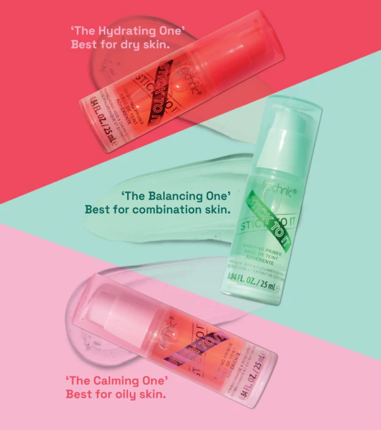 Formulado con cuidado, Stick To It de Technic Cosmetics está disponible en tres fórmulas específicas para el cuidado de la piel, cada una diseñada para preparar el rostro, mejorar la adherencia del maquillaje y adaptarse perfectamente a tu tipo de piel.