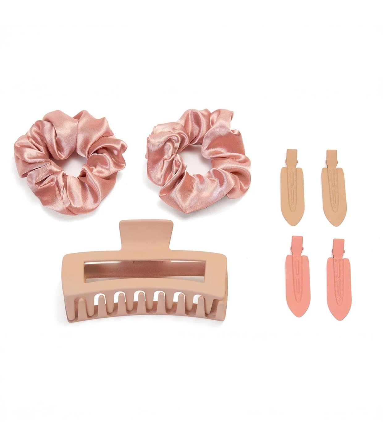 Incluye una pinza de garra resistente, perfecta para recogidos rápidos y elegantes, coleteros de satén, que cuidan y protegen el cabello evitando tirones, y pinzas sin marcas, ideales para sujetar el pelo mientras te maquillas o peinas.