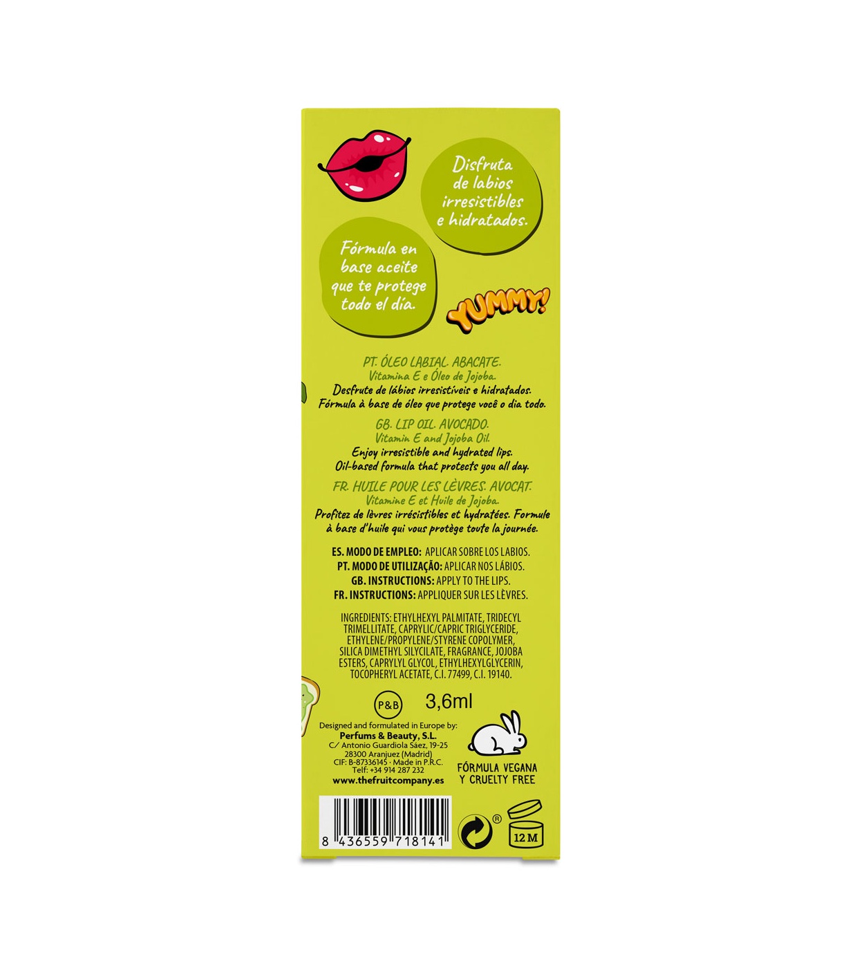 El aceite labial de aguacate de The Fruit Company es la opción perfecta para mantener tus labios hidratados y protegidos durante todo el día.