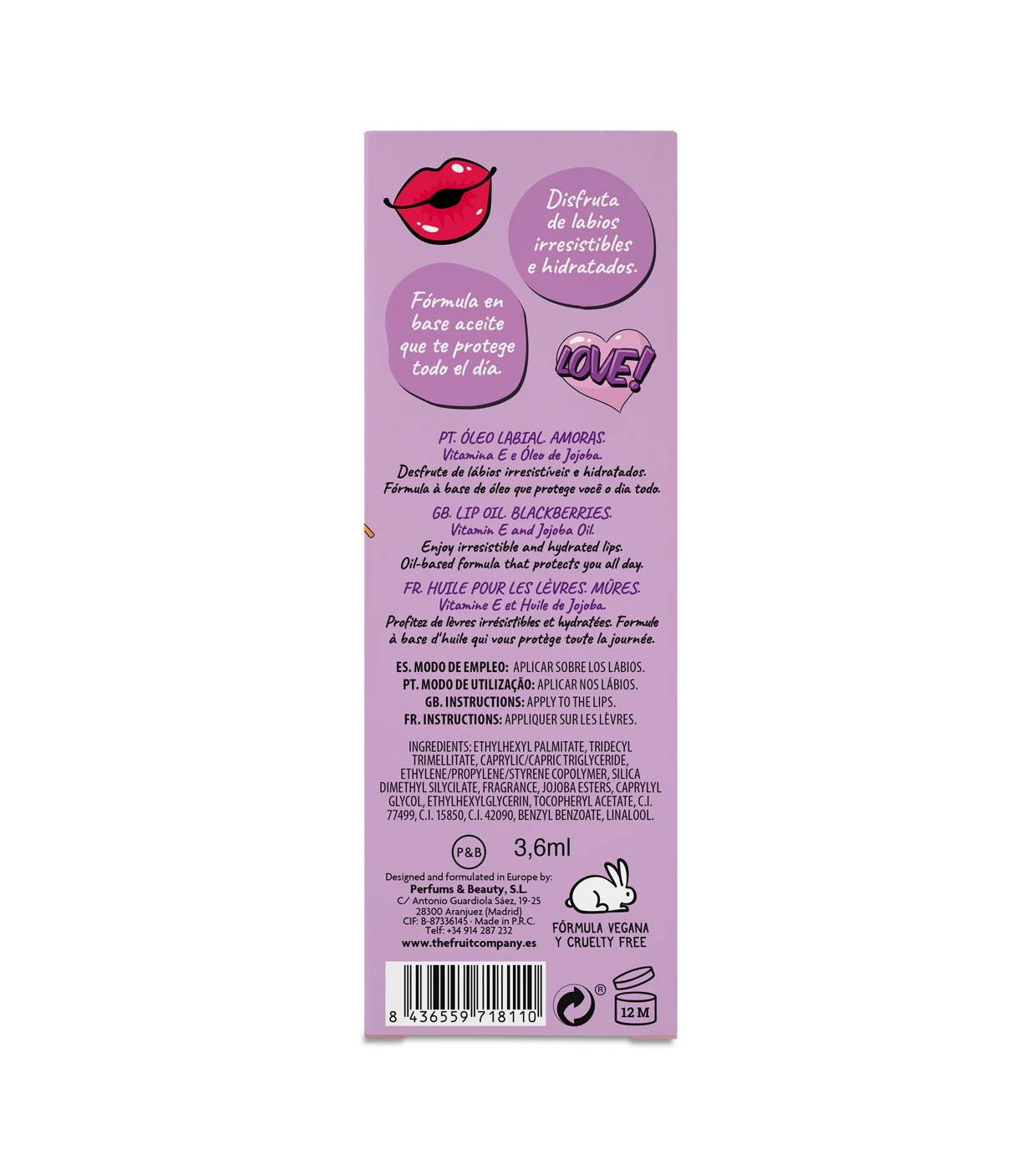 Descubre el aceite labial Moras de The Fruit Company, perfecto para mantener tus labios suaves, hidratados y protegidos durante todo el día.