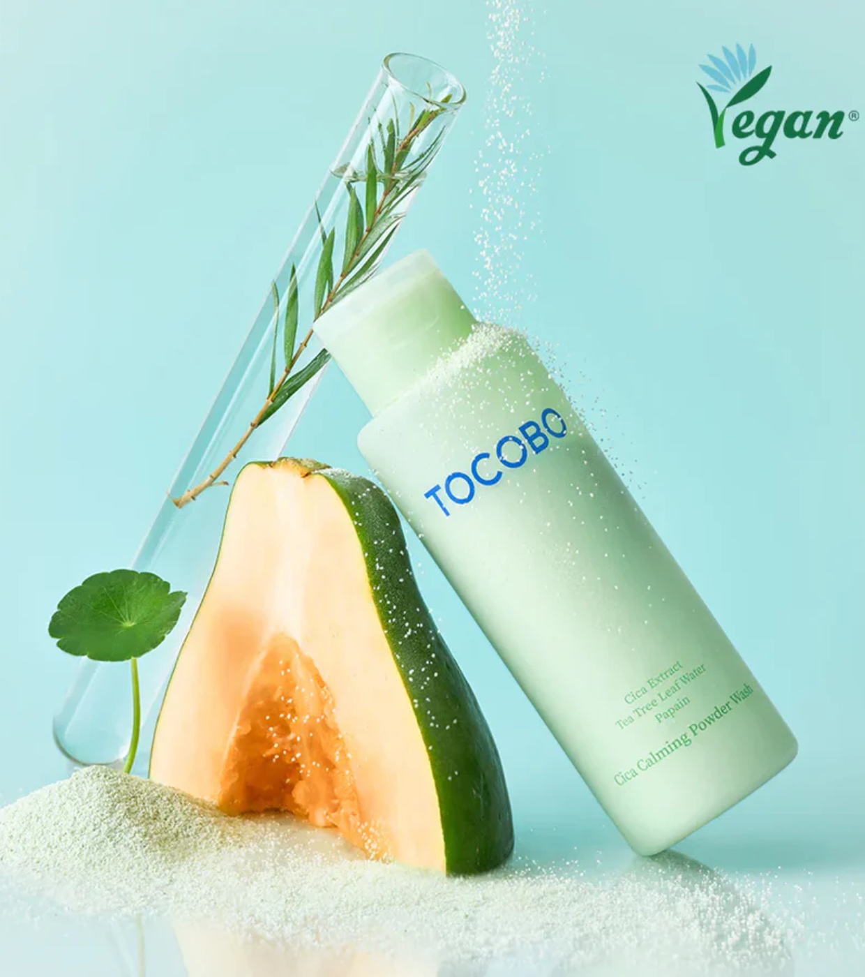 Descubre el poder del Cica Calming limpiador facial en polvo de Tocobo, el limpiador en polvo enzimático que tu piel sensible estaba esperando.