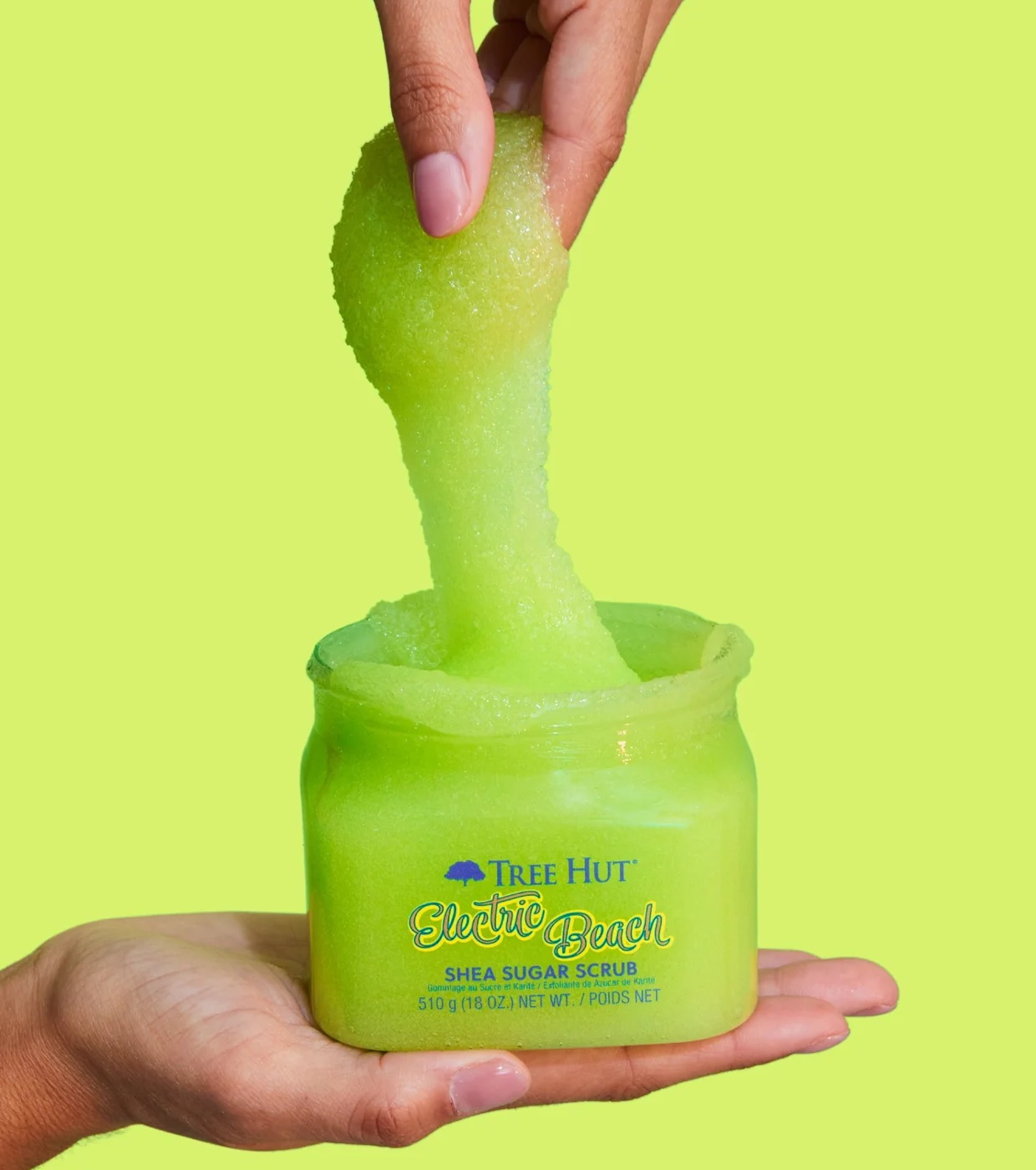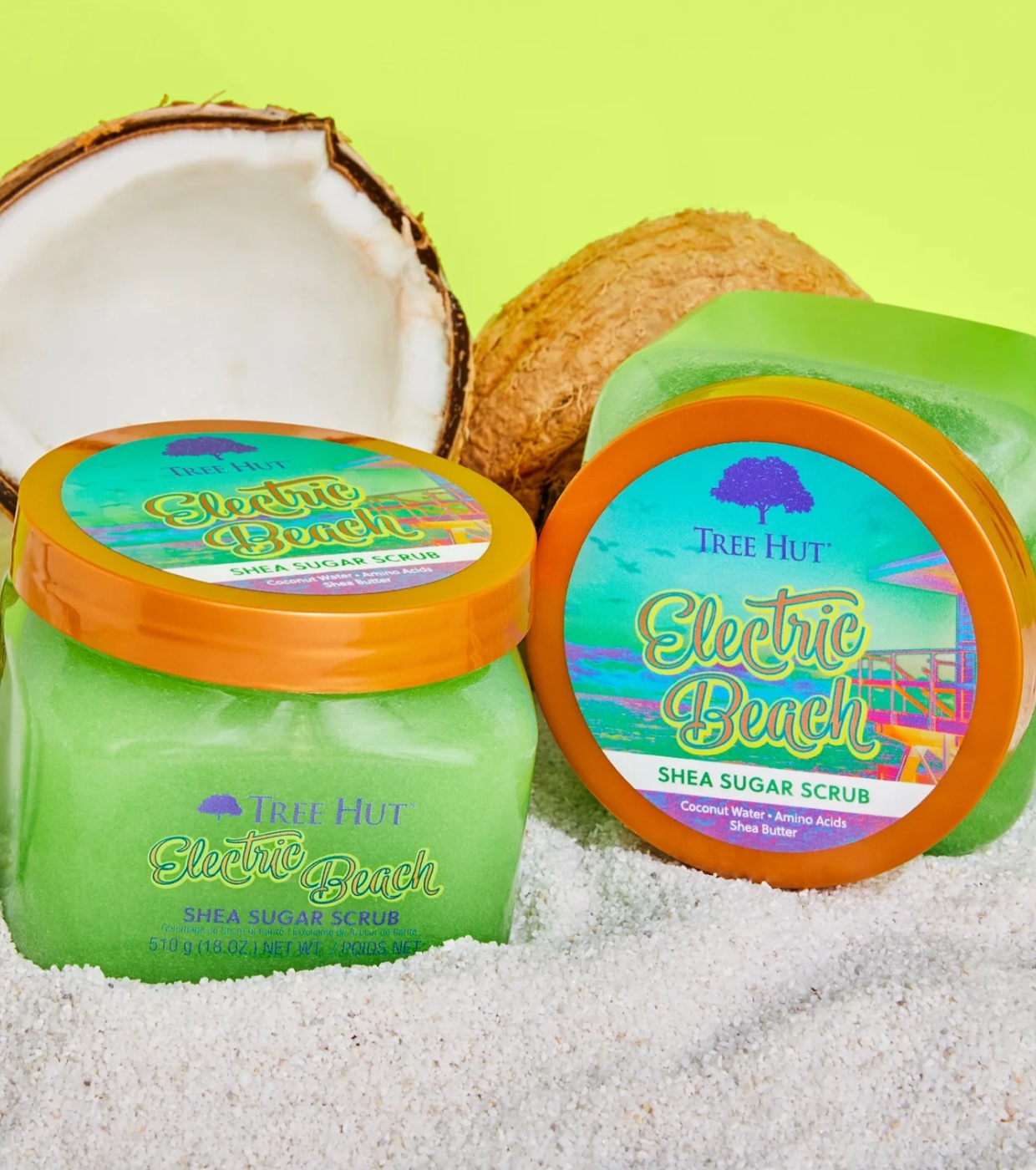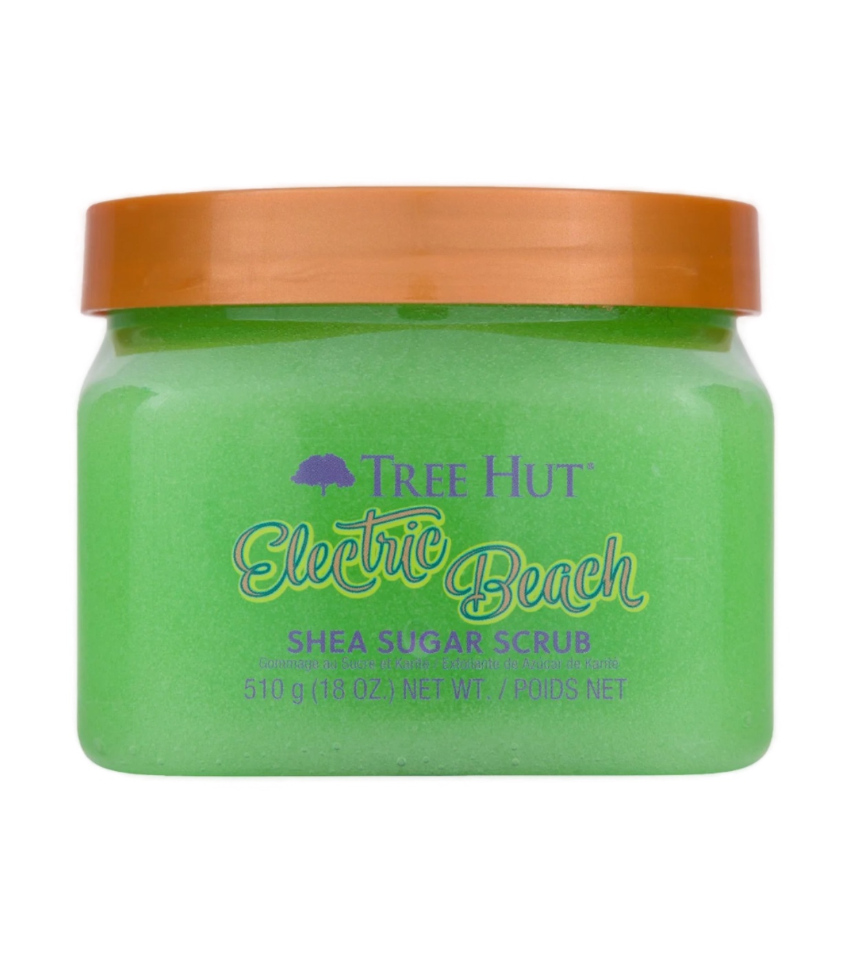 Mejora tu rutina de ducha y luce una piel radiante con el exfoliante corporal Shea Sugar Scrub de Tree Hut, en el irresistible aroma Electric Beach.