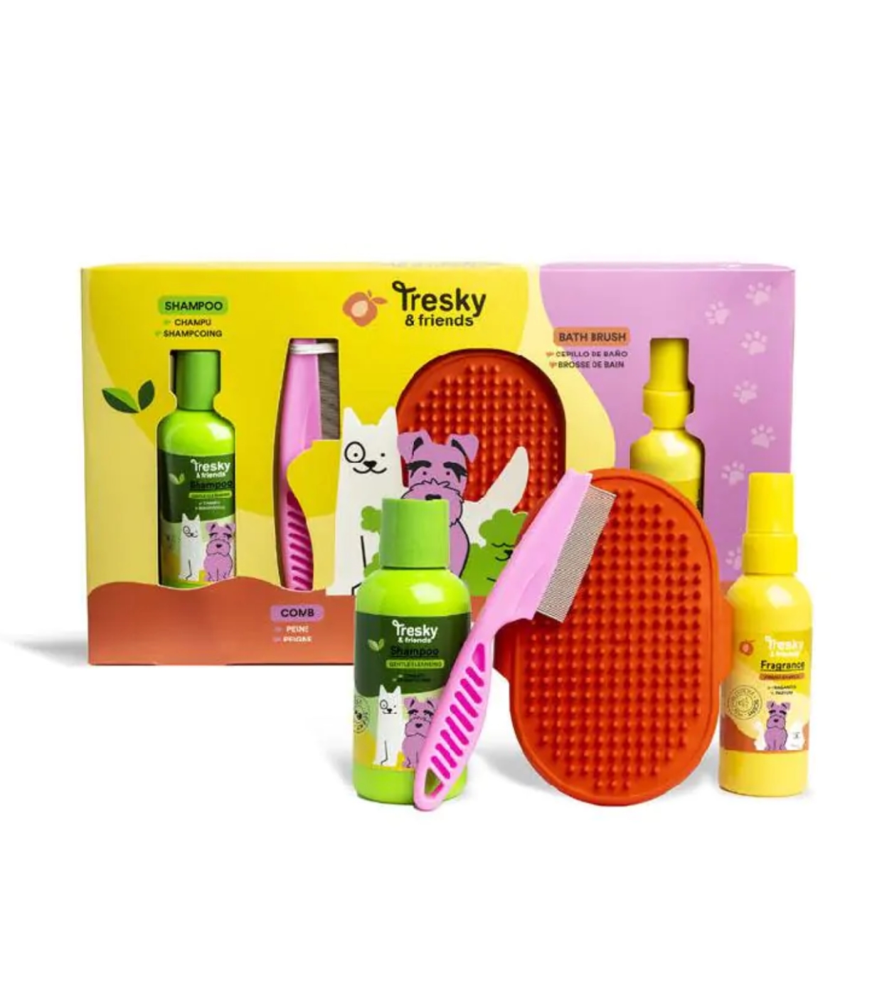 Convierte el baño de tu perro en una experiencia de cuidado completa con este set de Tresky & Friends diseñado para mimar su piel y mantener su pelaje limpio, suave y brillante.