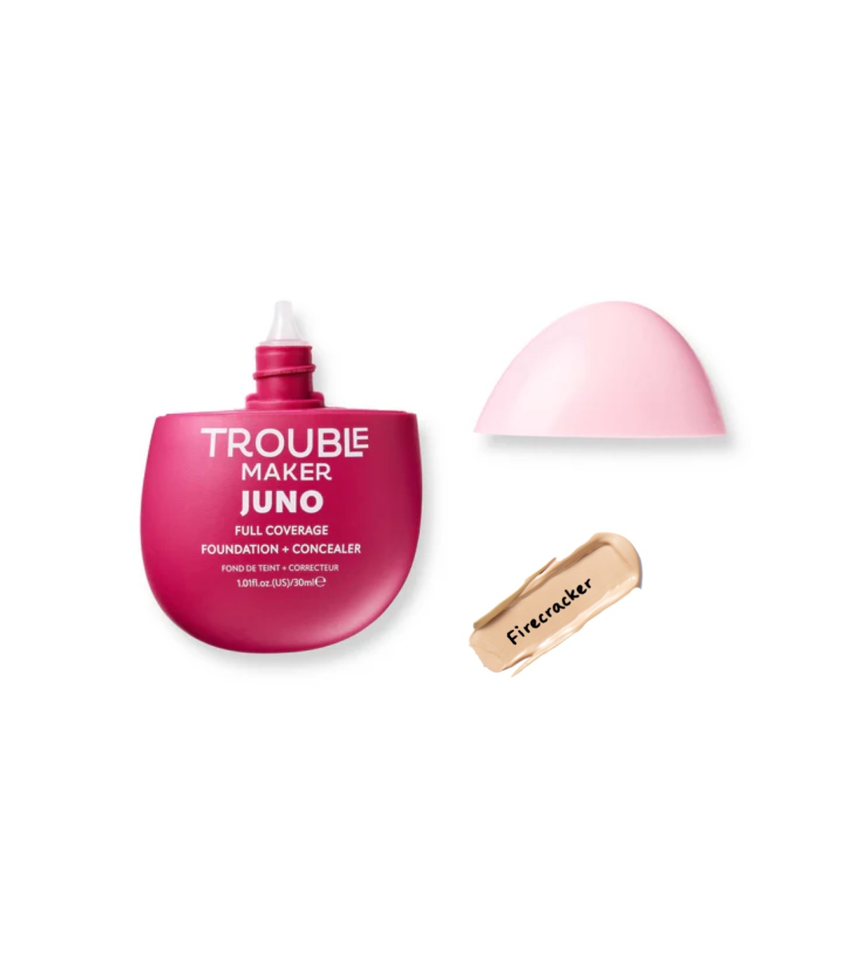 La base de maquillaje acabado mate Juno Full Coverage de Trouble Maker es la base definitiva para un look uniforme y duradero con un acabado mate suave.