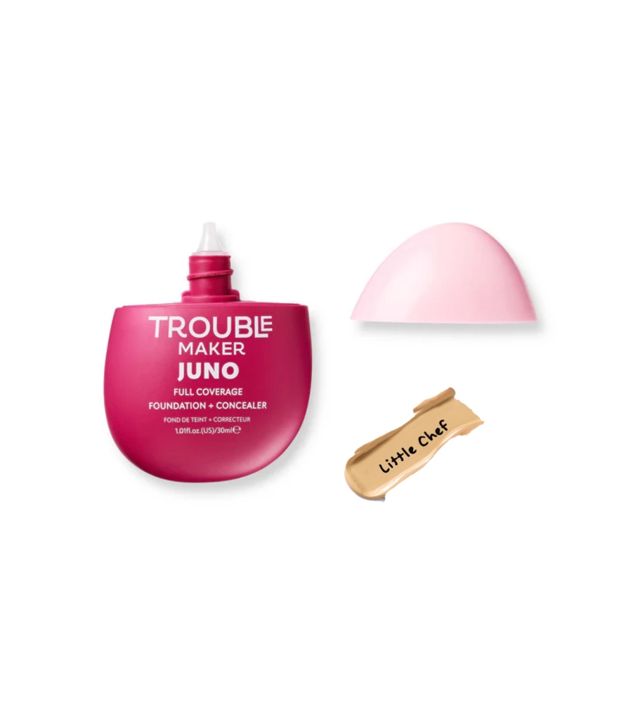 La base de maquillaje acabado mate Juno Full Coverage de Trouble Maker es la base definitiva para un look uniforme y duradero con un acabado mate suave.