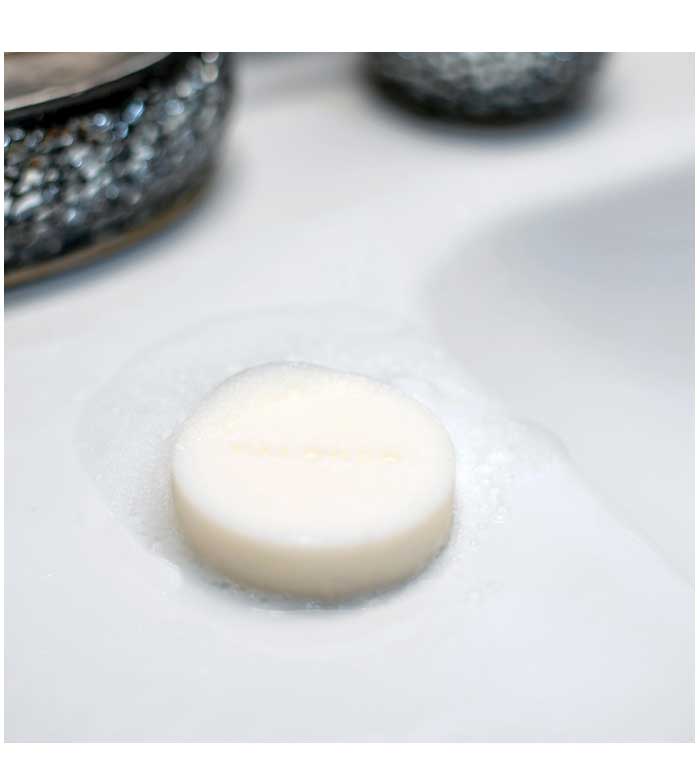 Frota la pastilla directamente sobre el pelo húmedo hasta obtener la espuma deseada