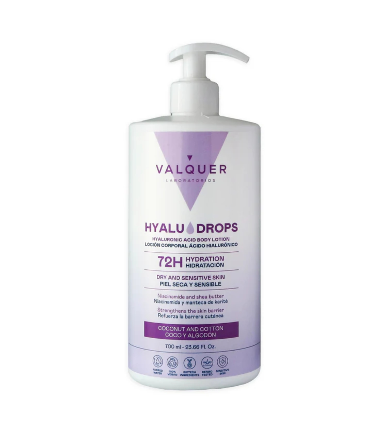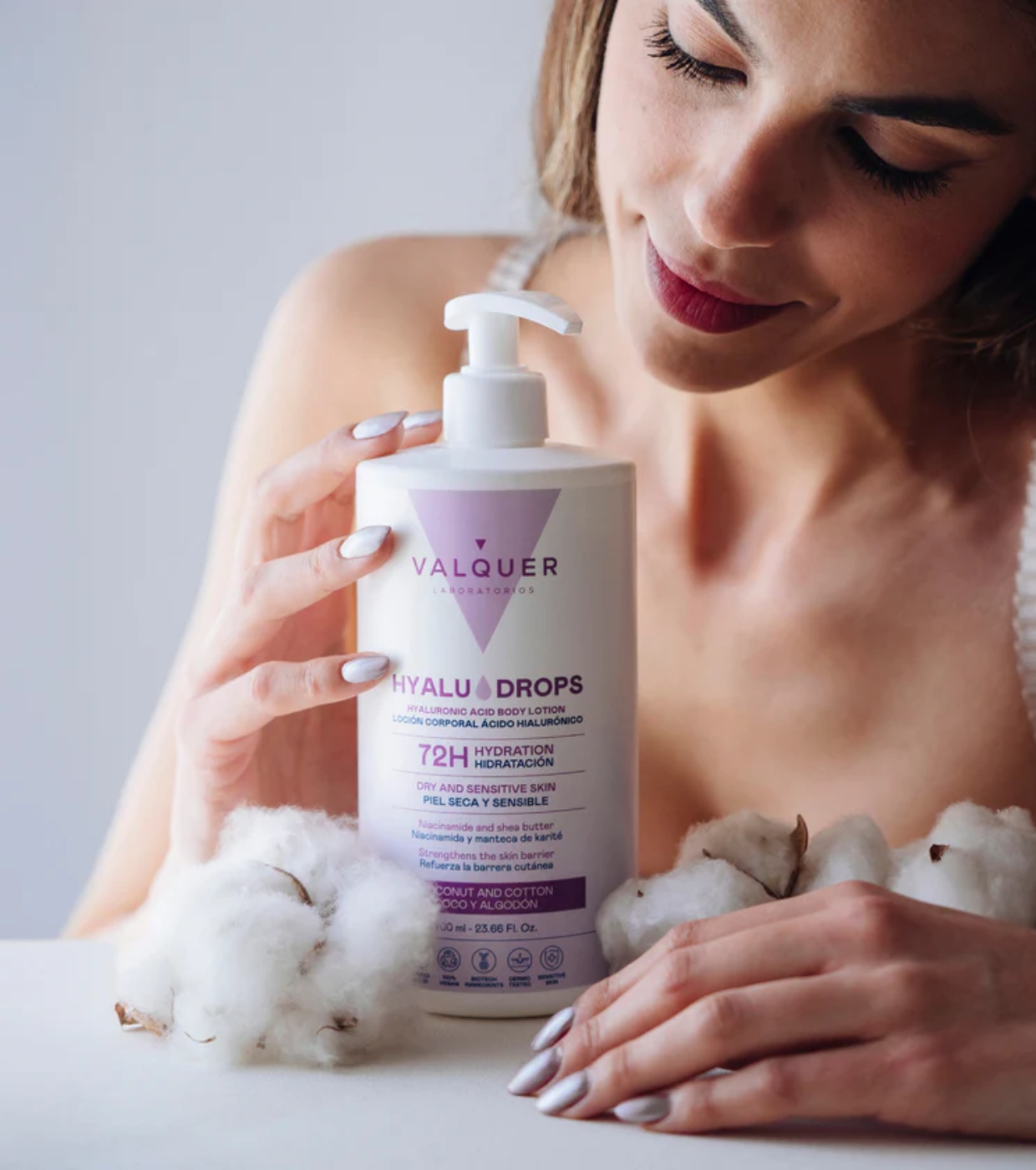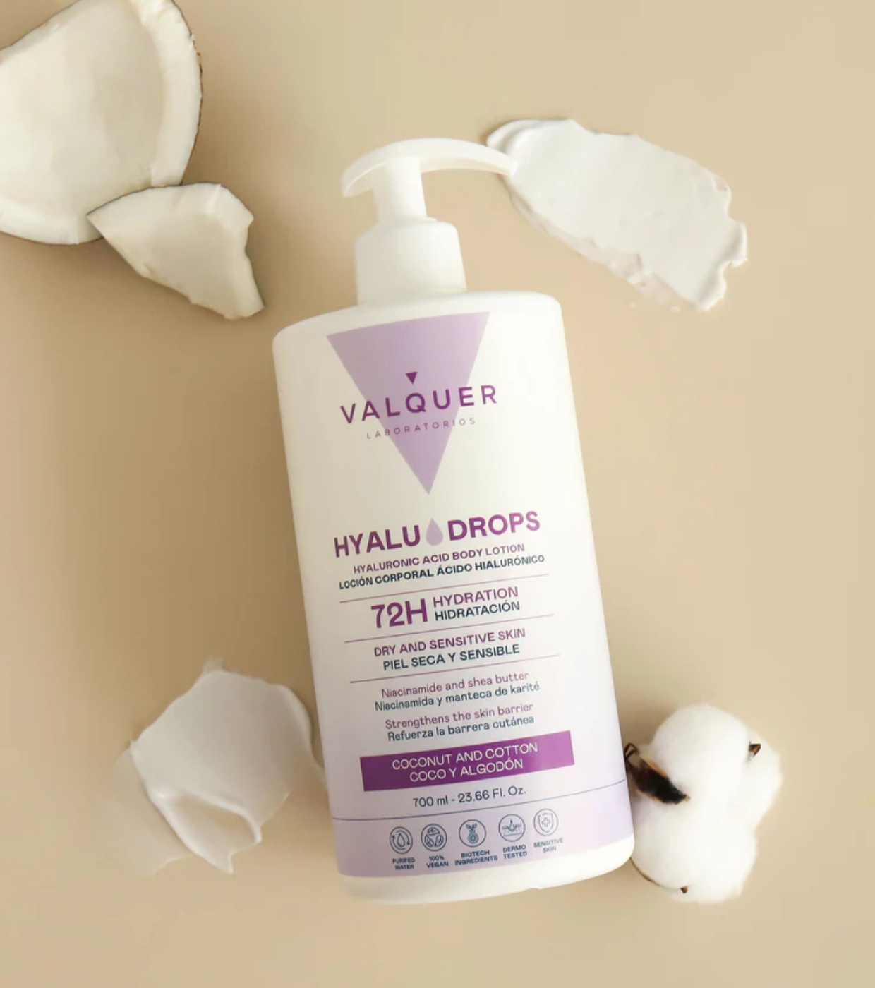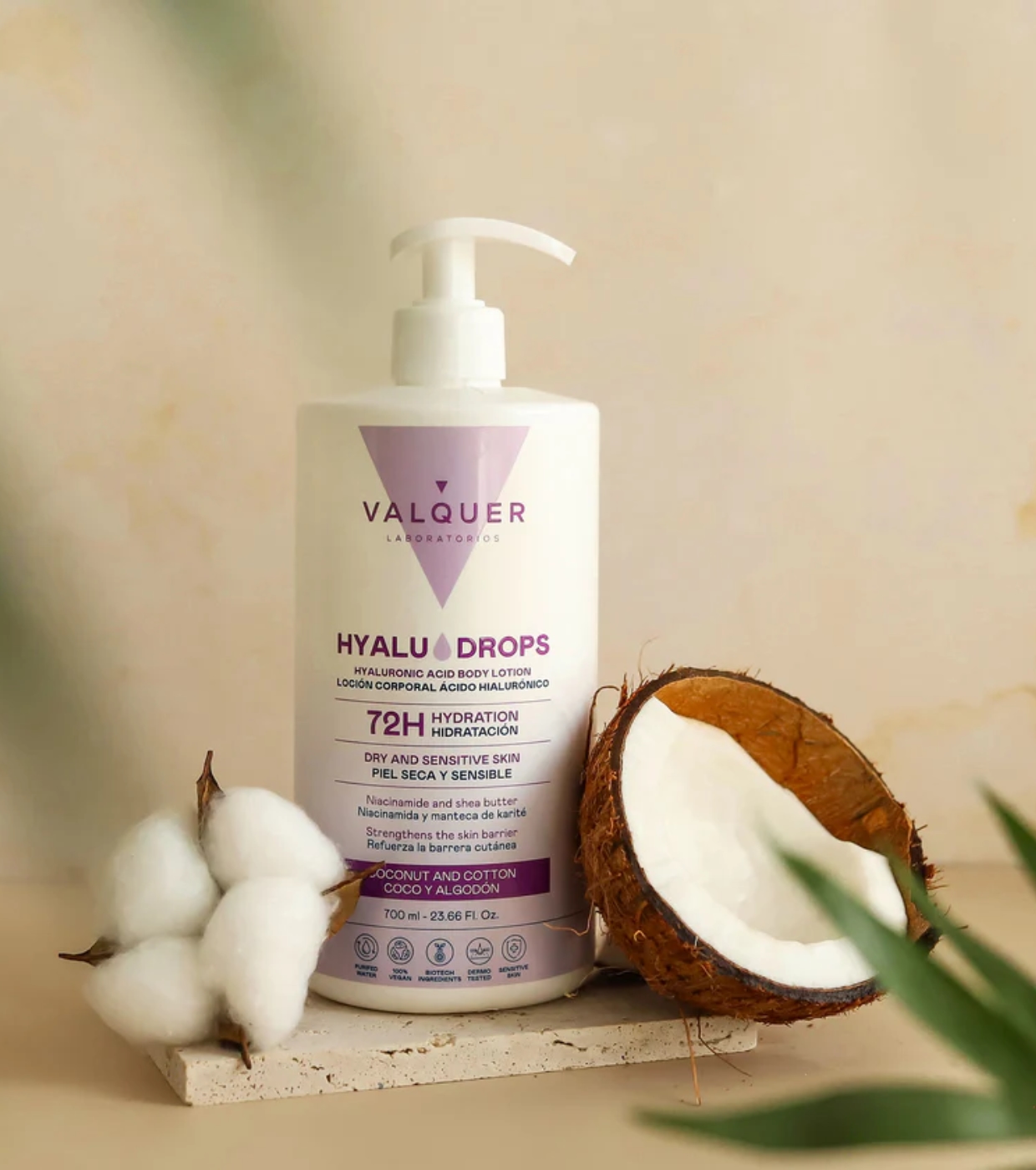 Déjate envolver por la suavidad tropical de la Hyaludrops loción corporal Coco y Algodón de Valquer, una fórmula hidratante avanzada que nutre, refresca y calma la piel con cada aplicación.