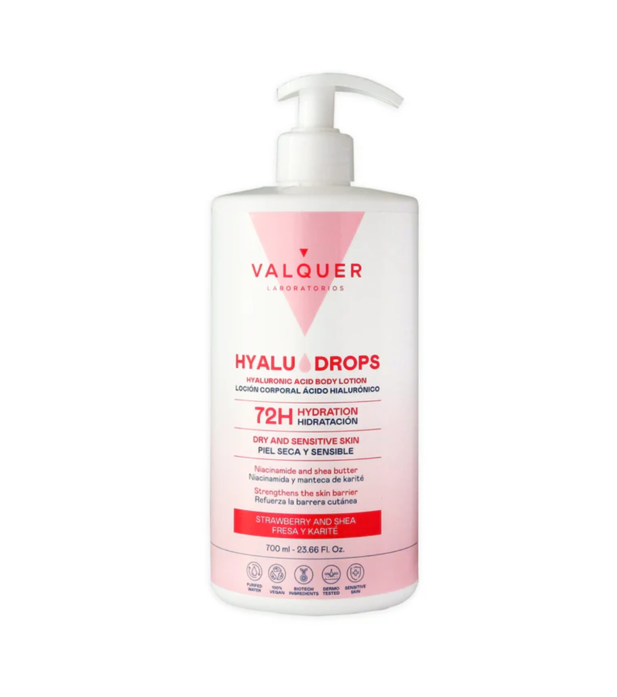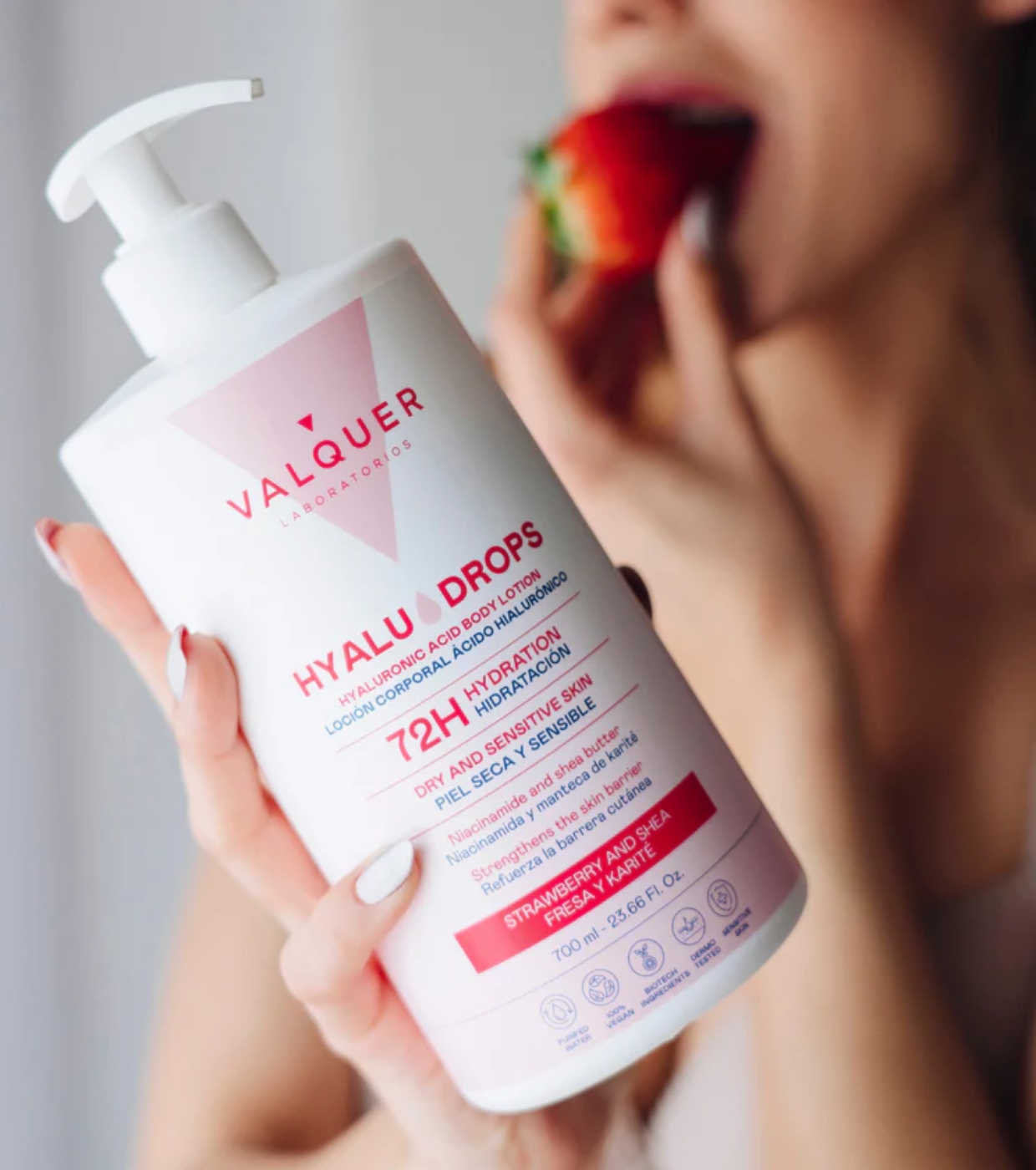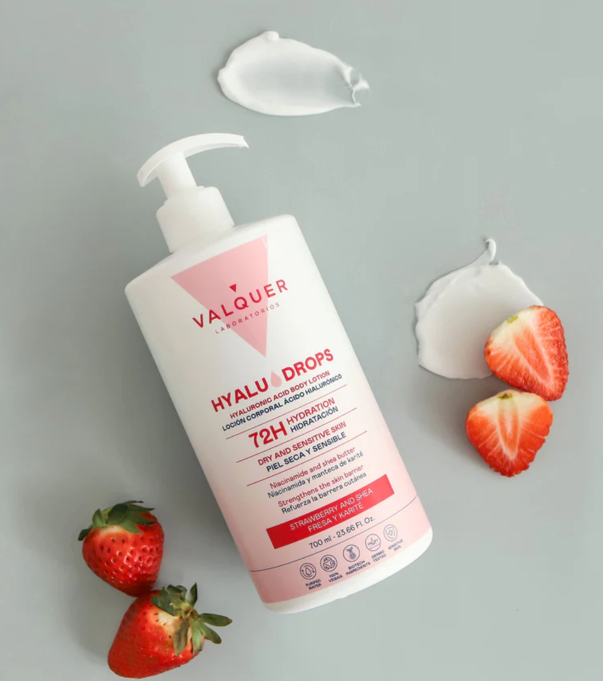 Mima tu piel cada día con la loción corporal Hyaludrops Fresa y Karité de Valquer, una loción de textura sedosa y absorción rápida que combina lo mejor de la hidratación y la nutrición con un aroma dulce y envolvente a fresa fresca.