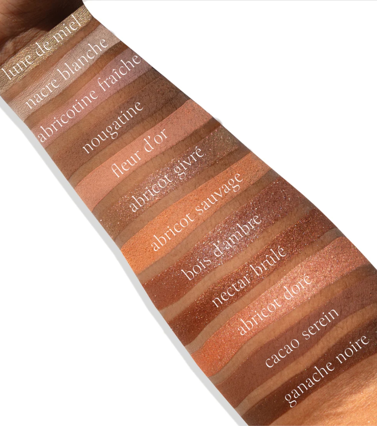 Shade 1 (Lune de Miel): Calcium Sodium Borosilicate, Octyldodecyl Stearoyl Stearate, Synthetic Fluorphlogopite, Calcium Aluminum Borosilicate, Talc, Zinc Stearate, Silica. Shades 2 (Nacre Blanche), 3 (Abricotine Fraîche), 4 (Nougatine), 5 (Fleur d'Or), 11 (Cacao Serein): Talc, Octyldodecyl Stearoyl Stearate, Zinc Stearate. Shade 6 (Abricot Givré): Calcium Sodium Borosilicate, Octyldodecyl Stearoyl Stearate, Calcium Aluminum Borosilicate, Silica, Zinc Stearate, Talc. Shade 7 (Abricot Sauvage): Talc, Lauroyl Lysine, Octyldodecyl Stearoyl Stearate, Zinc Stearate. Shade 8 (Bois d'Ambre): Calcium Sodium Borosilicate, Calcium Aluminum Borosilicate, Octyldodecyl Stearoyl Stearate, Talc, Zinc Stearate, Silica, Synthetic Fluorphlogopite. Shade 9 (Nectar Brûlé): Calcium Sodium Borosilicate, Talc, Octyldodecyl Stearoyl Stearate, Zinc Stearate, Synthetic Fluorphlogopite, Silica. Shade 10 (Abricot Doré): Octyldodecyl Stearoyl Stearate, Synthetic Fluorphlogopite, Calcium Sodium Borosilicate, Zinc Stearate. Shade 12 (Ganache Noire): Octyldodecyl Stearoyl Stearate, Talc, Zinc Stearate. (May Contain +/-: Mica CI 77019, Titanium Dioxide CI 77891, Iron Oxides CI 77491/ 77499/ 77492, Synthetic Fluorphlogopite, Ultramarines Blue CI 77007, Red 40 Lake CI 16035, Aluminum CI 77000, Tin Oxide CI 77861, Yellow 5 Lake CI 19140, Carmine CI 75470, Sodium