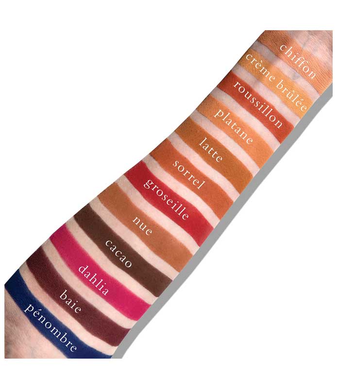 Shades 1 Chiffon, 2 Cre?me Brule?e, 3 Roussillon, 4 Platane, 8 Nue, 6 Sorrel, 10 Dahlia, 11 Baie: Talc, Mica, Octyldodecyl Stearoyl Stearate, Zinc Stearate. Shades 5 Latte, 7 Groseille, 9 Cacao: Talc, Mica, Zinc Stearate, Octyldodecyl Stearoyl Stearate. Shade 12 Pe?nombre: Talc, Mica, Octyldodecyl Stearoyl Stearate, Zinc Stearate, Sodium Benzoate, Potassium Sorbate. Vegan Shades: 1,2,3,4,5,6,9,10,11. (MayContain +/-: Titanium Dioxide CI77891, Iron Oxides CI77491/77492/77499, Yellow 5 CI19140, Manganese Violet CI77742, Red 40 Lake CI15850, Ferric Ferrocyanide CI 77510, Ultramarines Blue CI 77007, Red 7 Lake CI 15850, Red 28 CI 45410, Carmine CI 75470, Black 2 CI 77266.)