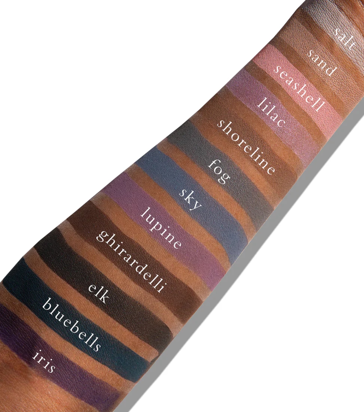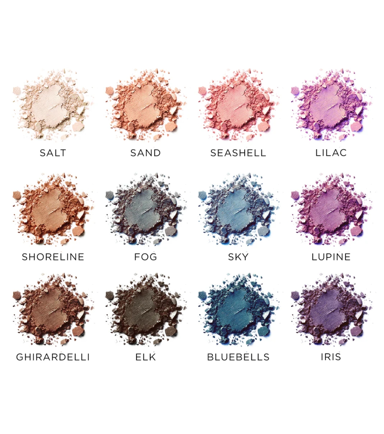Shade 1 (Salt), Shade 2 (Sand), Shade 3 (Seashell), Shade 5 (Shoreline), Shade 6 (Fog), Shade 7 (Sky), Shade 8 (Lupine), Shade 9 (Ghiradelli), Shade 10 (Elk), Shade 11 (Bluebells), Shade 12 (Iris): Talc, Mica, Octyldodecyl Stearoyl Stearate, Zinc Stearate. Shade 4 (Lilac): Talc, Mica, Octyldodecyl Stearoyl Stearate, Zinc Stearate, Silica. (+/- may contain +/-: Tin Oxide CI 77861, Titanium Dioxide CI 77891, Iron Oxides CI 77491/77492/77499, Red 40 CI 16035, Carmine CI 75470, Black 2 CI 77266, Ferric Ferrocyanide CI 77510, Manganese Violet CI 77742, Ultramarine Blue CI 77007)