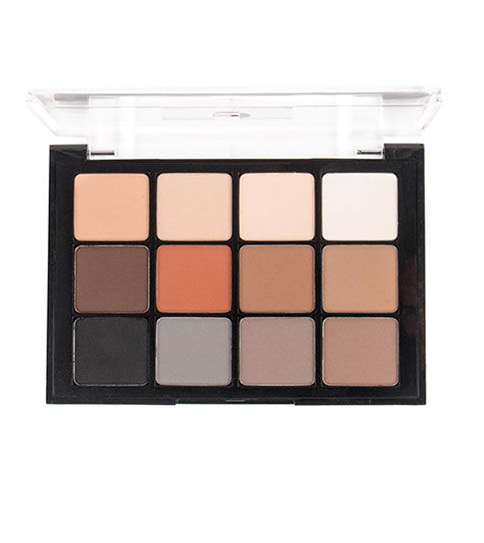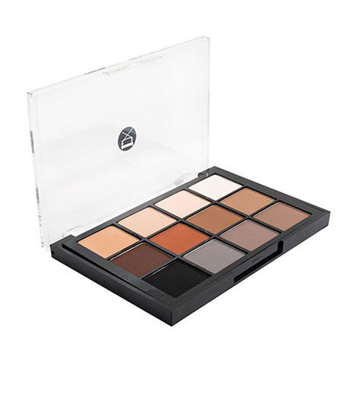 Una paleta de sombras de ojos con 12 tonos mate desde neutros claros hasta marrones profundos.