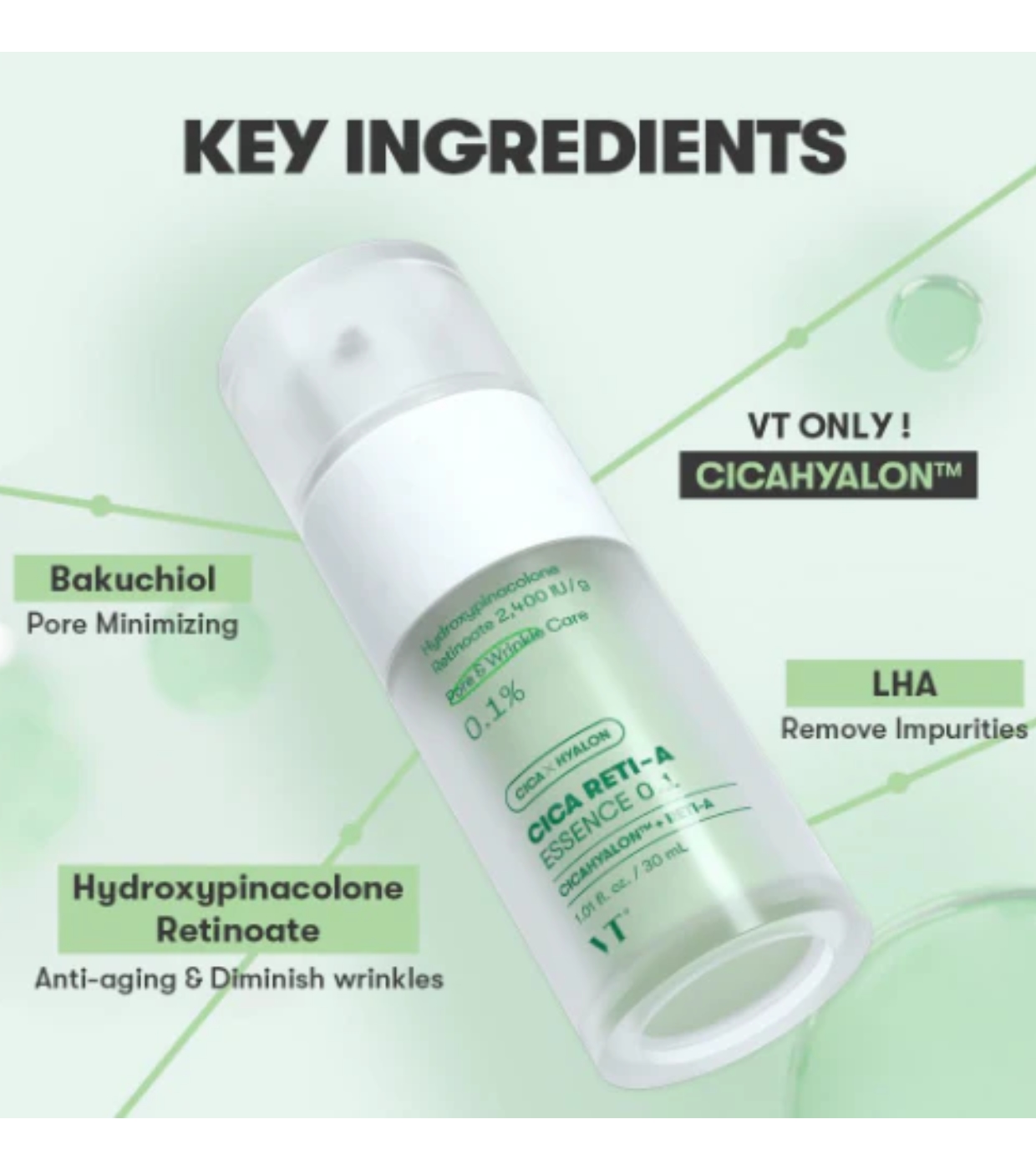 La Essence Reti Cica 0.1 de VT Cosmetics es una esencia concentrada diseñada para refinar poros, mejorar la textura de la piel y combatir los signos de la edad, manteniendo al mismo tiempo una acción suave y respetuosa.