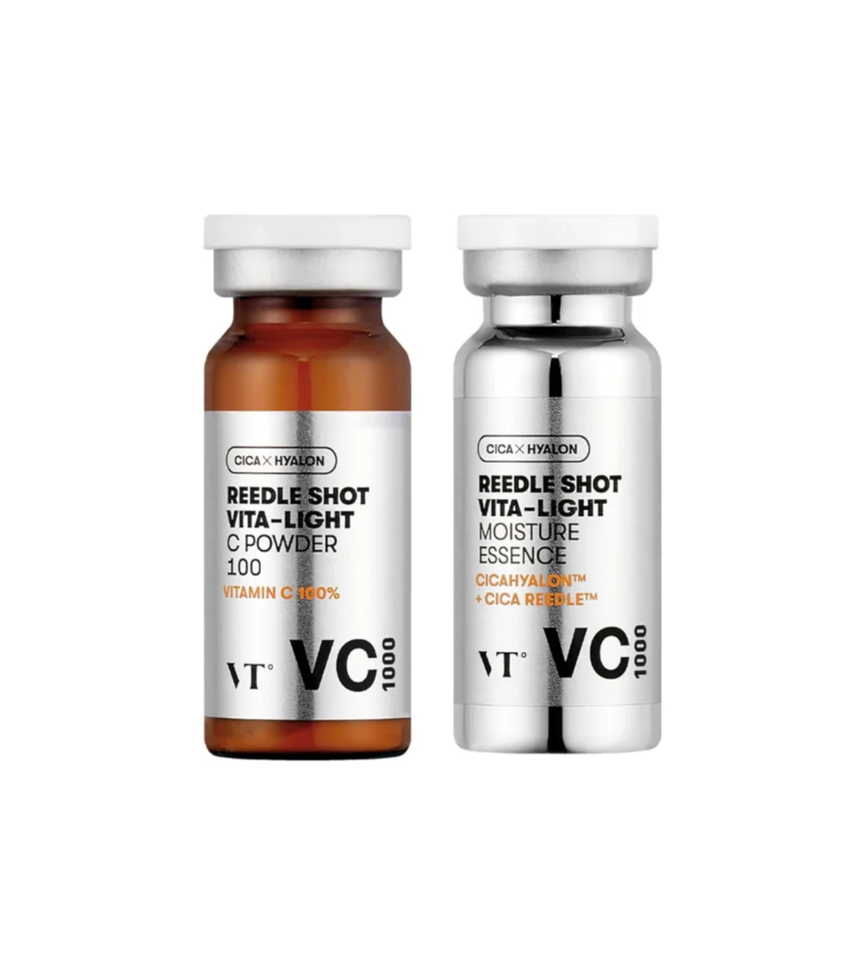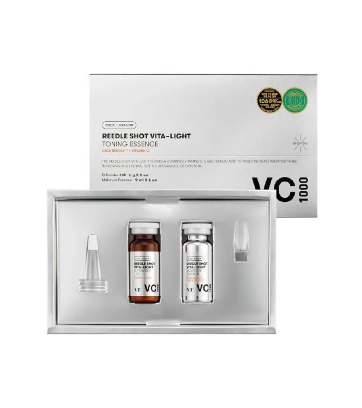 Transforma tu rutina facial con la esencia tonificante Reedle Shot Vita-Light VC1000 de VT Cosmetics, una esencia revolucionaria diseñada para mejorar el tono, la hidratación y la textura de tu piel.