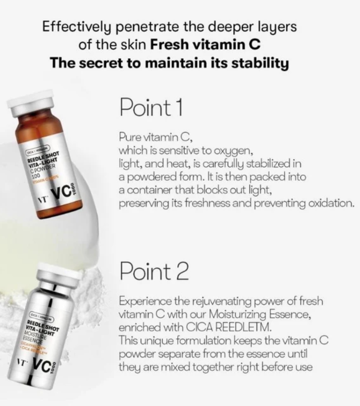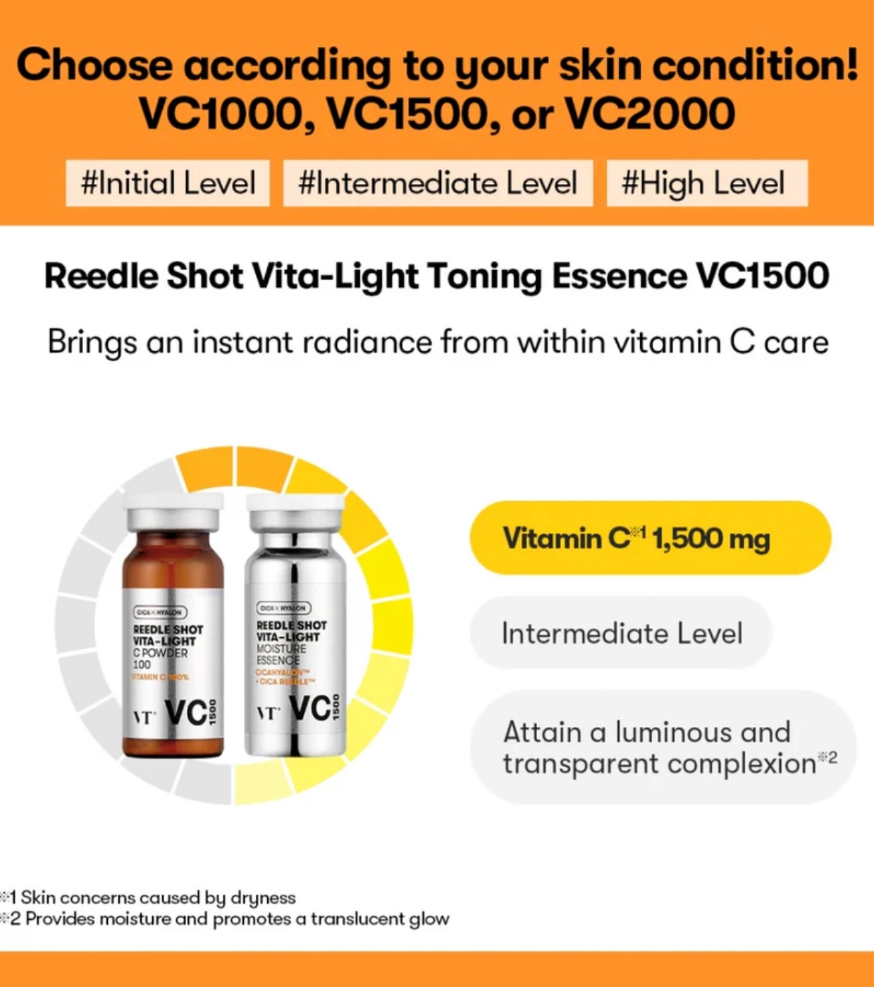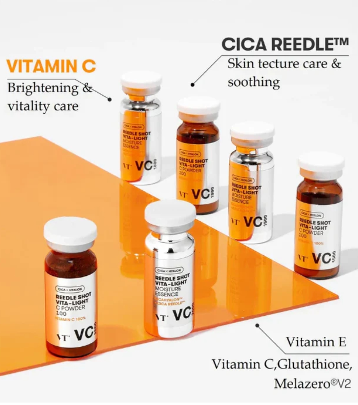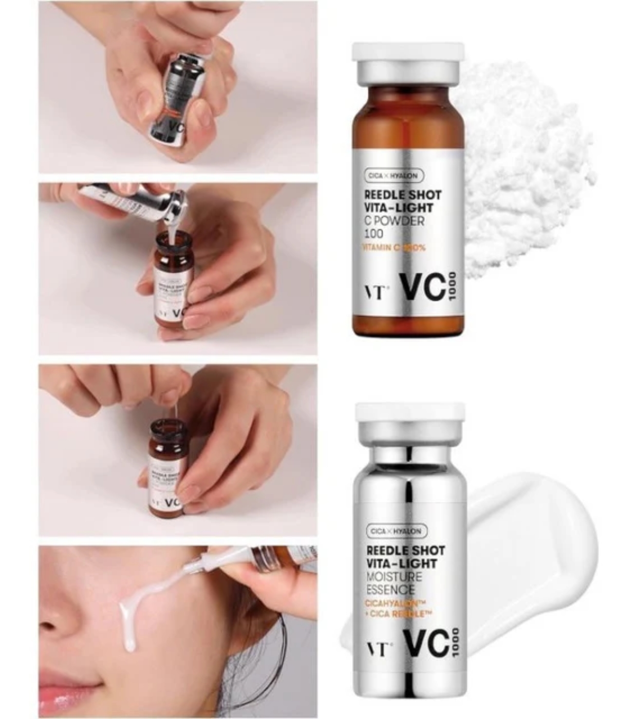 - Textura y Sensación en la Piel: La textura ligera y húmeda de la VT Reedle Shot Vita-Light Toning Essence VC 1000 se absorbe rápidamente, dejando la piel fresca, suave y luminosa sin sensación pegajosa. Perfecta para quienes buscan hidratación intensa.