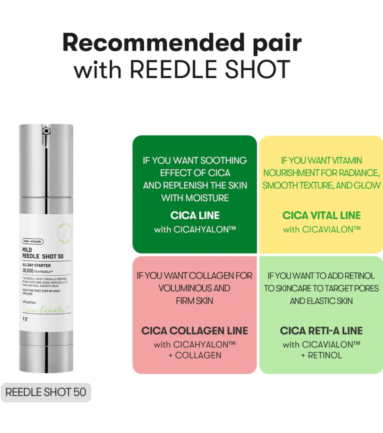El sérum con microagujas Reedle Shot 50 de VT Cosmetics es un sérum facial coreano revolucionario diseñado para transformar tu piel desde el interior.