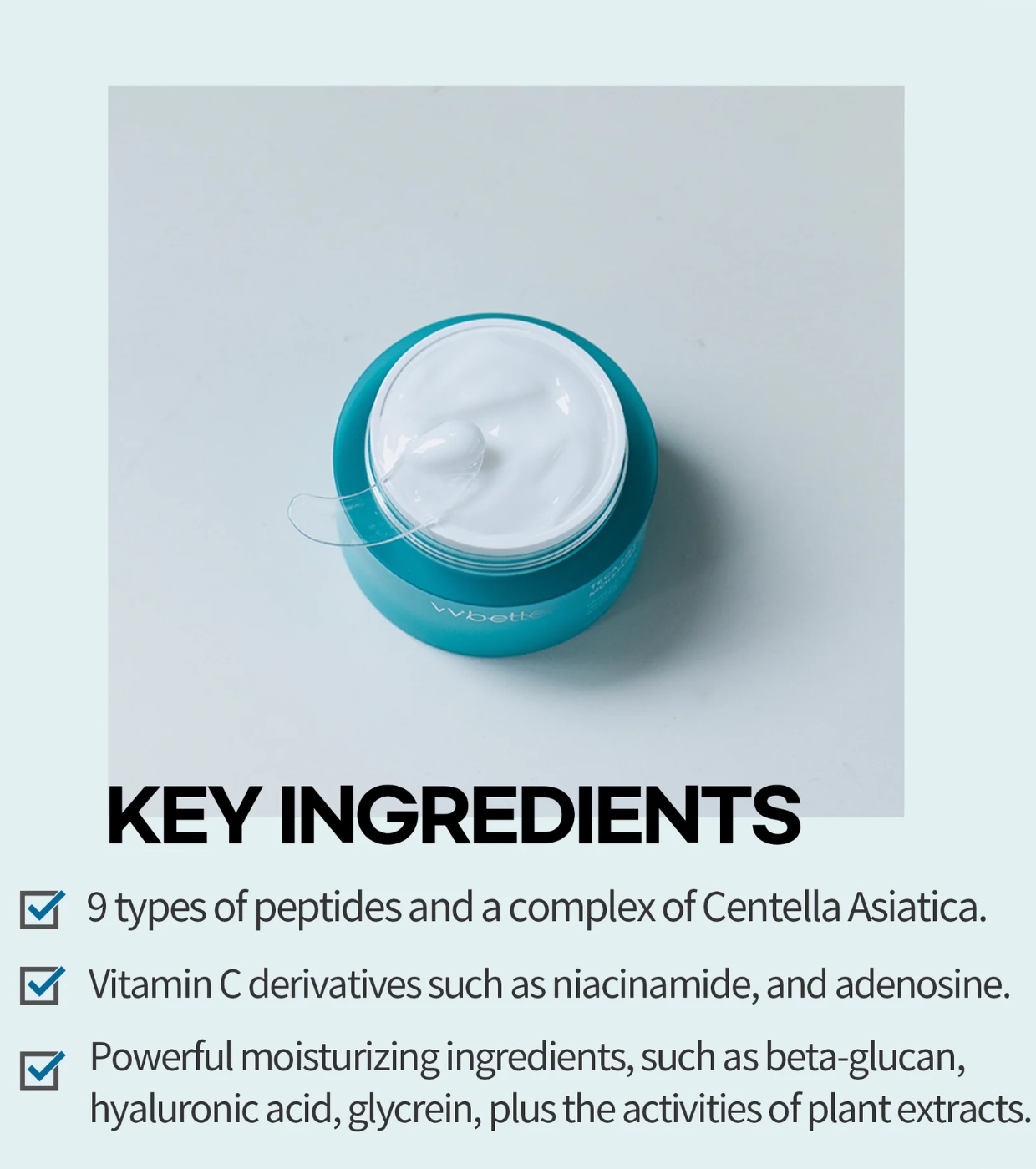 Centella Asiatica Extract, Methylpropanediol, Glycerin, Phenyl Trimethicone, Niacinamide, Dicaprylyl Ether, Dicaprylyl Carbonate, Cyclohexasiloxane, Polyglyceryl-3 Methylglucose Distearate, Isostearyl Alcohol, Butylene Glycol Cocoate, 1.2-Hexanediol, Glyceryl Stearate, Laminaria Japonica Extract, Eclipta Prostrata Leaf Extract (Bhringraj), Ficus Carica (Echte Feige) Fruit Extract, Hydrogenated Lecithin, Ammonium Acryloyldimethyltaurate/Vp Copolymer, Polyglyceryl-10 Laurate, Sodium Stearoyl Glutamate, Acrylates/C10-30 Alkyl Acrylate Crosspolymer, Tromethamine, Xanthan Gum, Ethylcellulose, Adenosine, Fructooligosaccharides, Beta Glucan, Hydrolyzed Collagen, Purified Water, Hydrolyzed Hyaluronic Acid, Ceramide Np, Butylene Glycol, Ethyl Ascorbyl Ether, Nonapeptide-1, Acetyl Hexapeptide-8, Copper Tripeptide-1, Tripeptide-1, Palmitoyl Tetrapeptide-7, Palmitoyl Tripeptide-1, Palmitoyl Pentapeptide-4, Hexapeptide-9, Sh-Oligopeptide-1, Fragrance, Ethylhexylglycerin, Capryl Glycol
