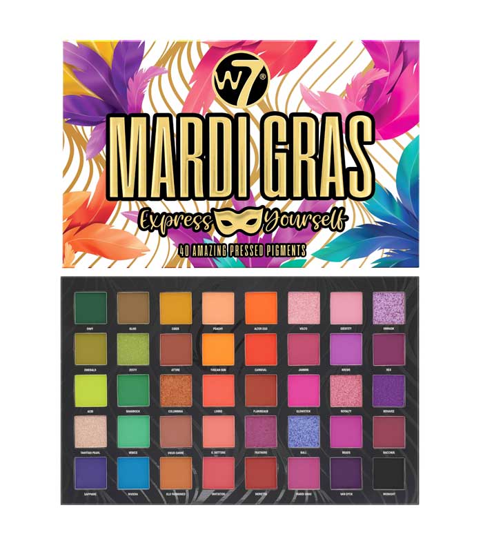 La paleta de pigmentos prensados Mardi Gras de W7 es la paleta que necesitas para dejar volar tu imaginación bajo el lema "Express Yourself".