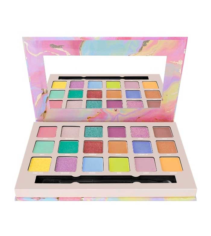 Contiene 18 sombras de ojos en tonos que van desde los rosas a los azules, verdes y violetas en acabados mates, satinados y brillos.