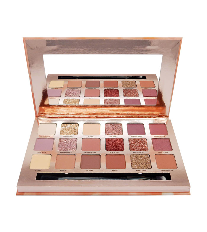 Paleta de sombras de ojos que consta de 18 tonos en acabados mate, glitter y shimmer.