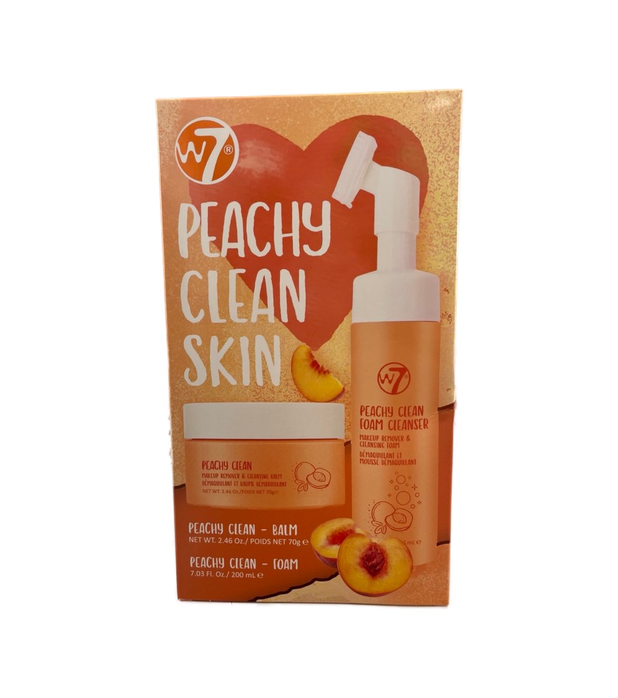 El W7 set para doble limpieza Peachy Clean Skin reúne los dos imprescindibles para una piel limpia, fresca y suave: el bálsamo desmaquillante Peachy Clean y la espuma limpiadora Peachy Clean.