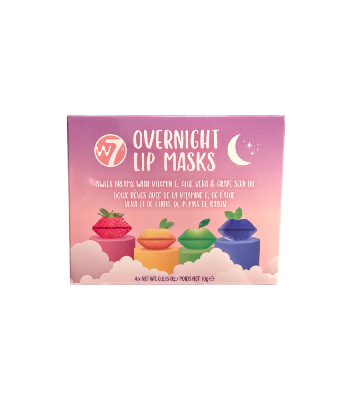 Despídete de los labios secos con el W7 Overnight Lip Masks Set, un pack de 4 mascarillas nocturnas enriquecidas con vitamina E, aloe vera y aceite de semilla de uva.