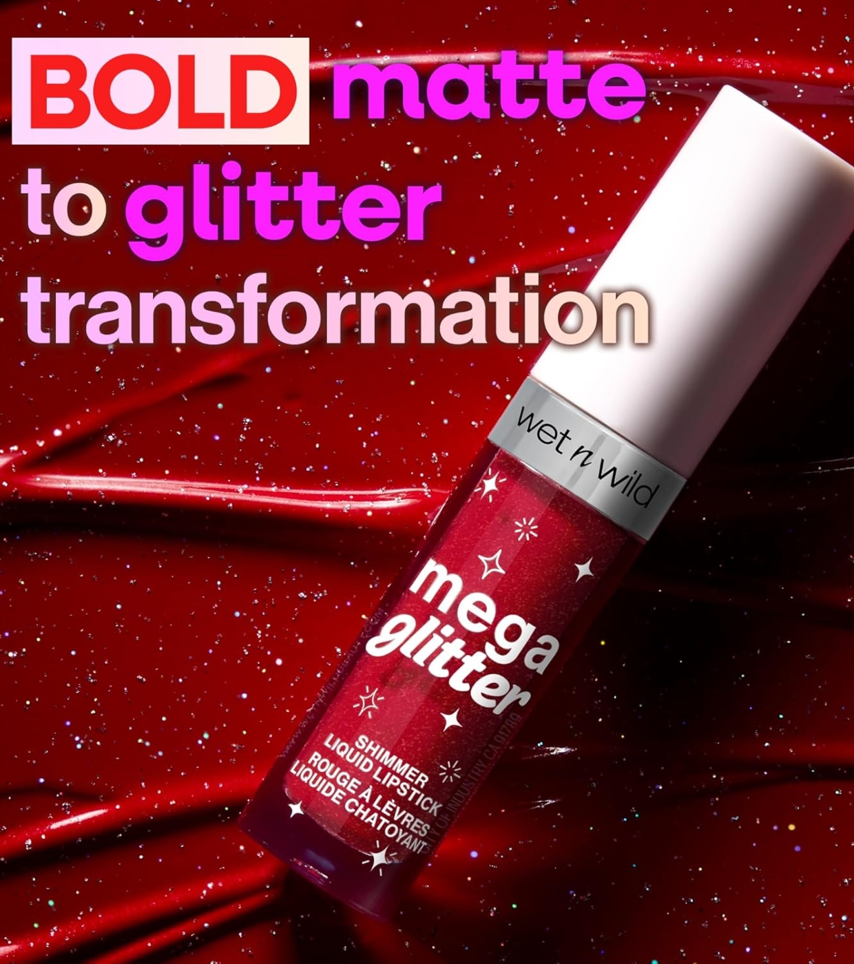 ¡Prepárate para deslumbrar! El Mega Glitter Shimmer Liquid Lipstick de wet n wild transforma tu look en segundos con su fórmula innovadora que pasa de un acabado mate a un brillo deslumbrante simplemente al presionar los labios.