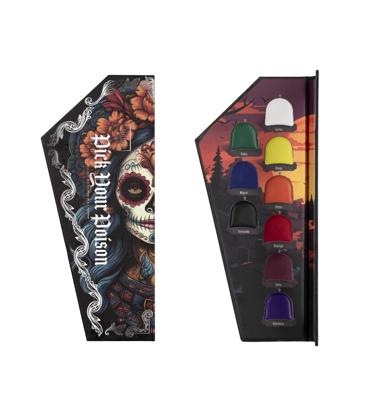 La paleta contiene 9 colores para crear los mejor looks este Haloween.