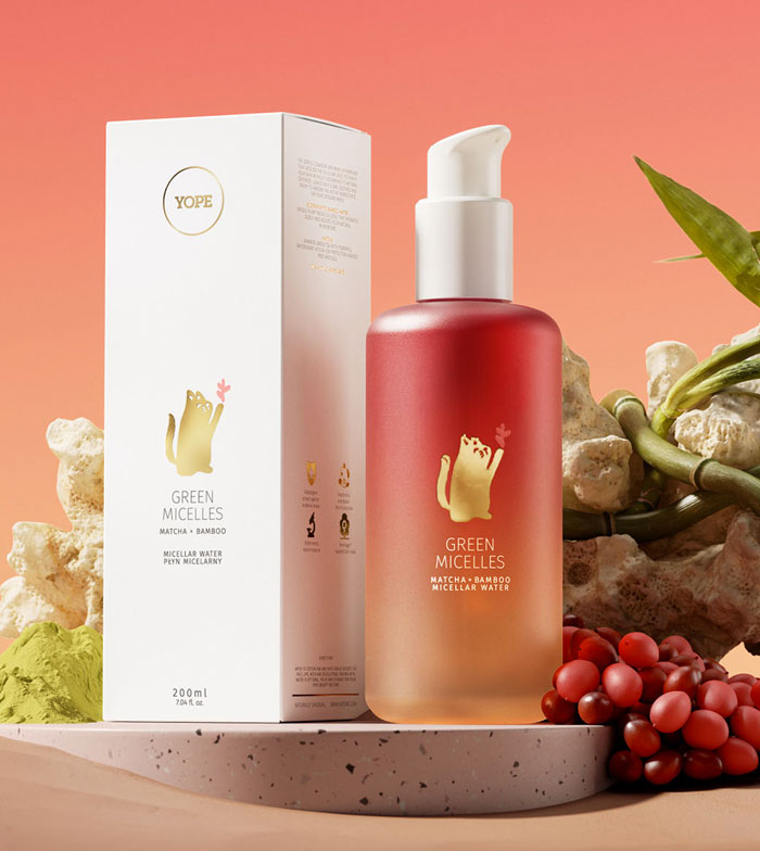 Las micelas verdes (partículas esféricas que absorben las impurezas) limpian suavemente la piel y retiran el maquillaje.
