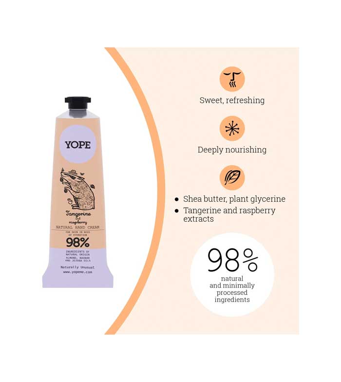 El extracto de mandarina, rico en vitamina C, para suavizar la piel seca y proporcionar fuertes efectos hidratantes y luminosos, y el extracto de frambuesa para aliviar los síntomas de irritación y estimular la regeneración de la piel.
