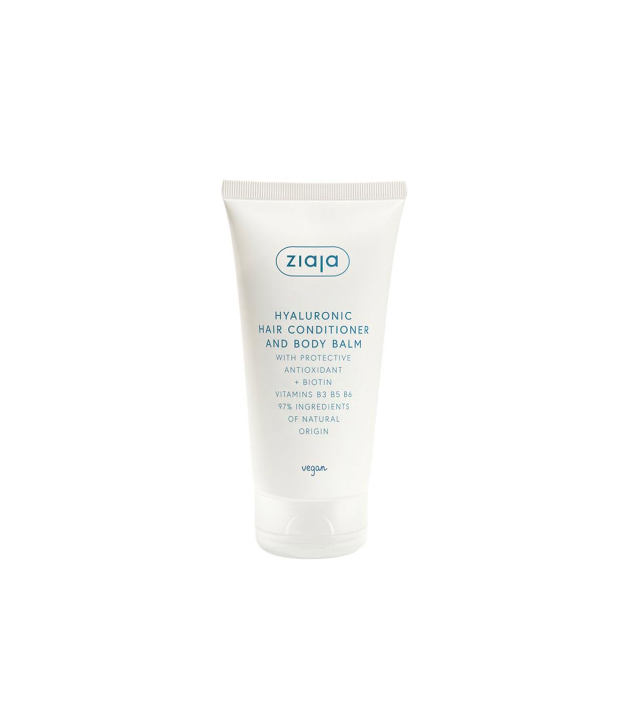 Acondicionador hialurónico hidratante capilar de Ziaja con protección antioxidante para cabellos dañados. Contiene ácido hialurónico e hidrata intensamente. También se puede utilizar como bálsamo corporal para el cuidado de la piel seca.