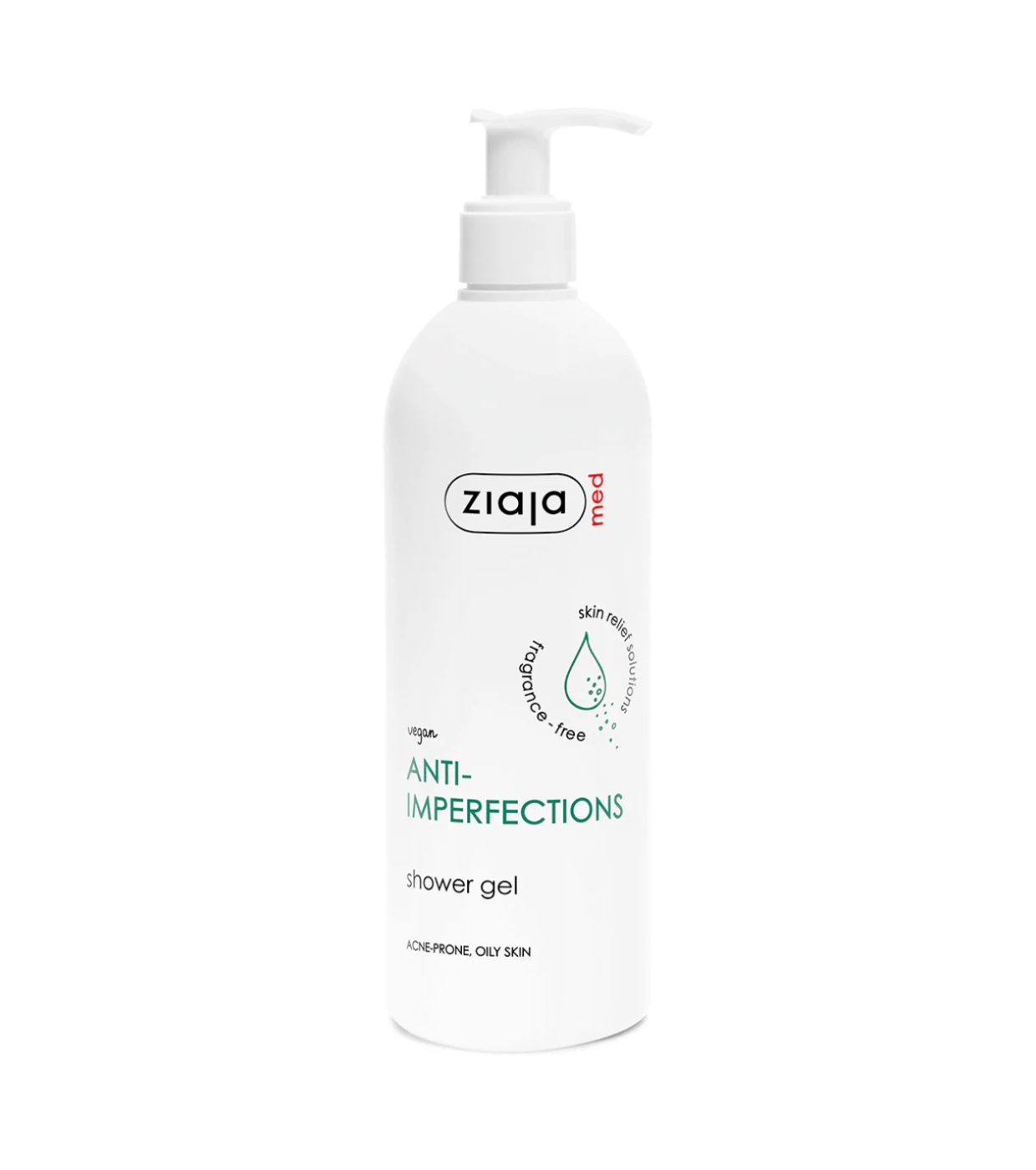 El gel de ducha Anti-imperfections de Ziaja Med está formulado para limpiar eficazmente la piel del exceso de sebo y aliviar las lesiones causadas por el acné, sin resecar la piel.